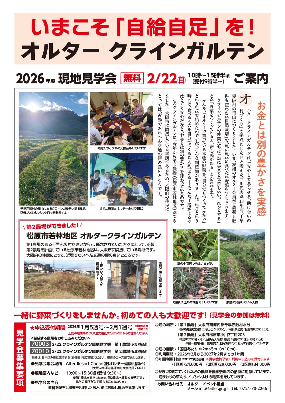 HOMEイベントオルタークラインガルテン現地見学会 « イベント一覧 オルタークラインガルテン現地見学会 2026年02月22日 10:00 ~ 15:30 « 「サバーファーム」で楽しむ オルターオーガニックバザール 生産者と会える!話せる!オルタークッキングイベント in TOKYO » イベント開催概要開催日2026年2月22日(日)会場「第1農場」大阪府南河内郡千早赤阪村水分/「第2農場」大阪府松原市小川3丁目203主催オルターお問合せ・参加お申込み固定電話0721-70-2266FAX番号0721-70-2299問い合わせ用メールアドレスメール送信 WEBお問合せ・感想 カレンダーに追加 Google カレンダー iCalendar Outlook 365 Outlook Live 詳細 日付: 2026年02月22日 時間: 10:00 ~ 15:30