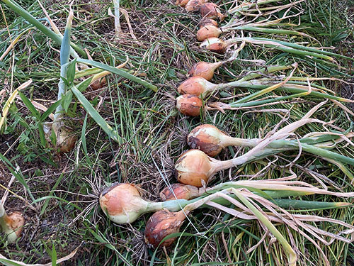 収穫した玉ねぎを畑で干しています